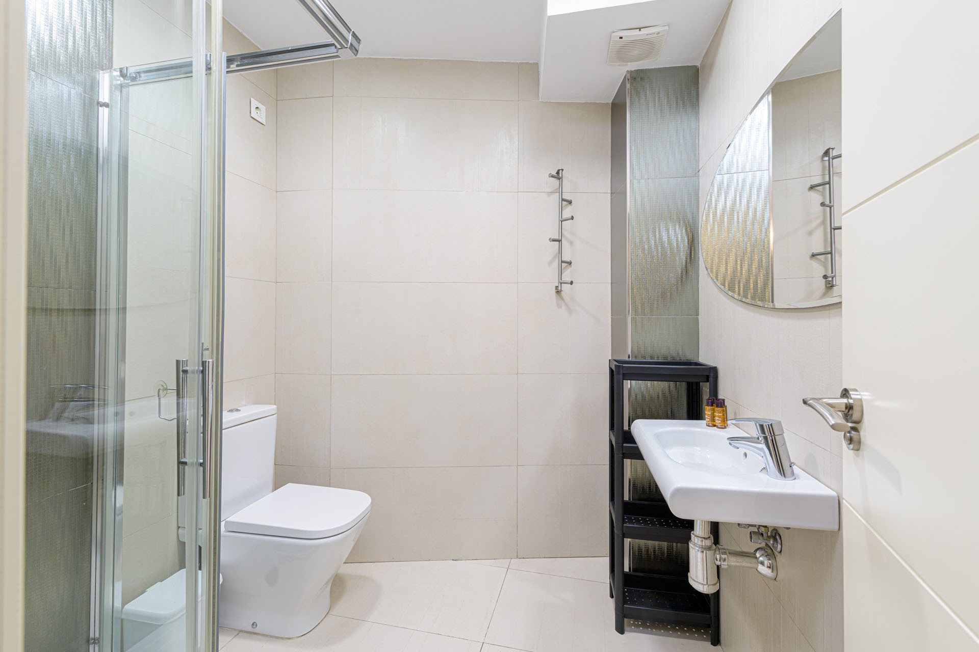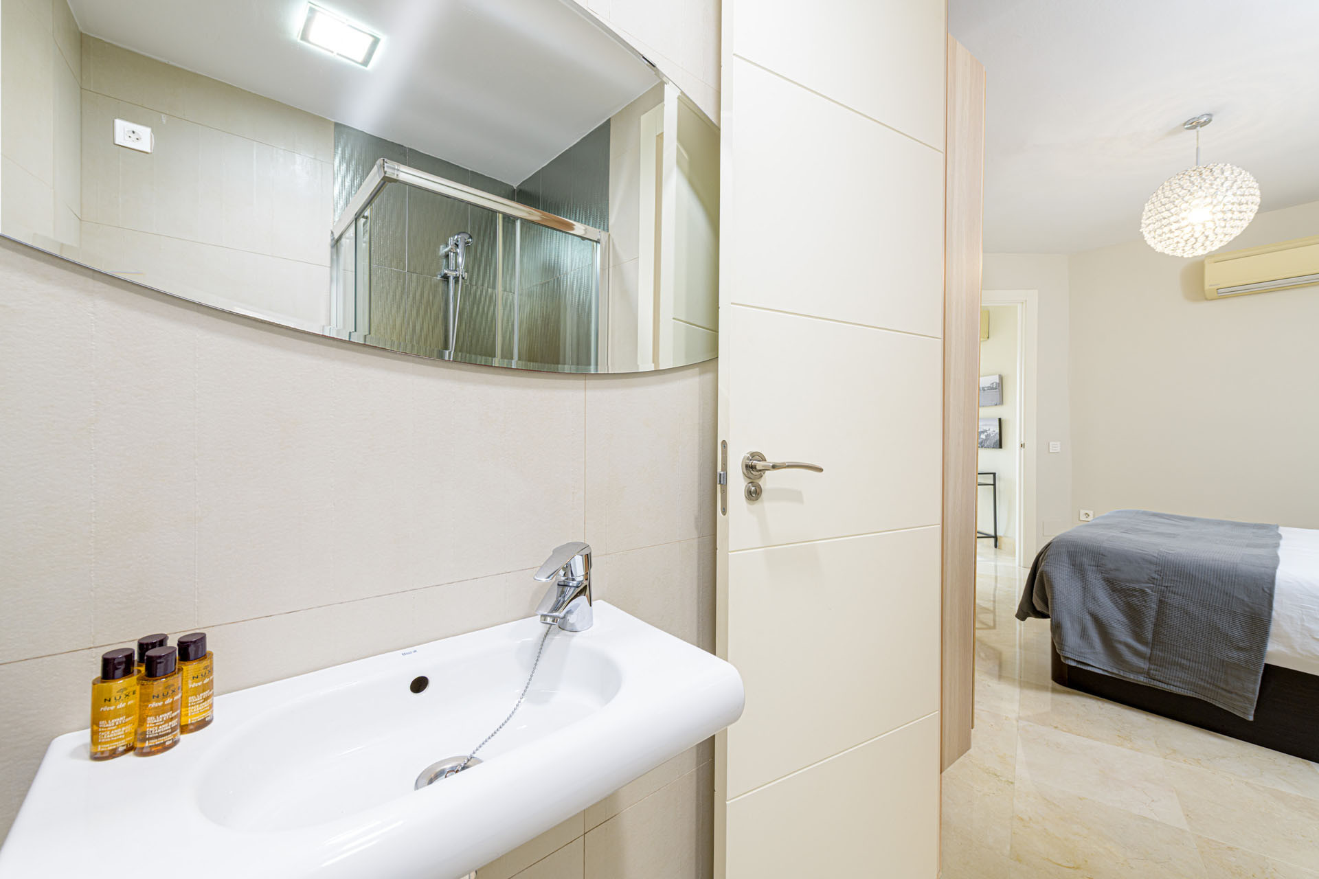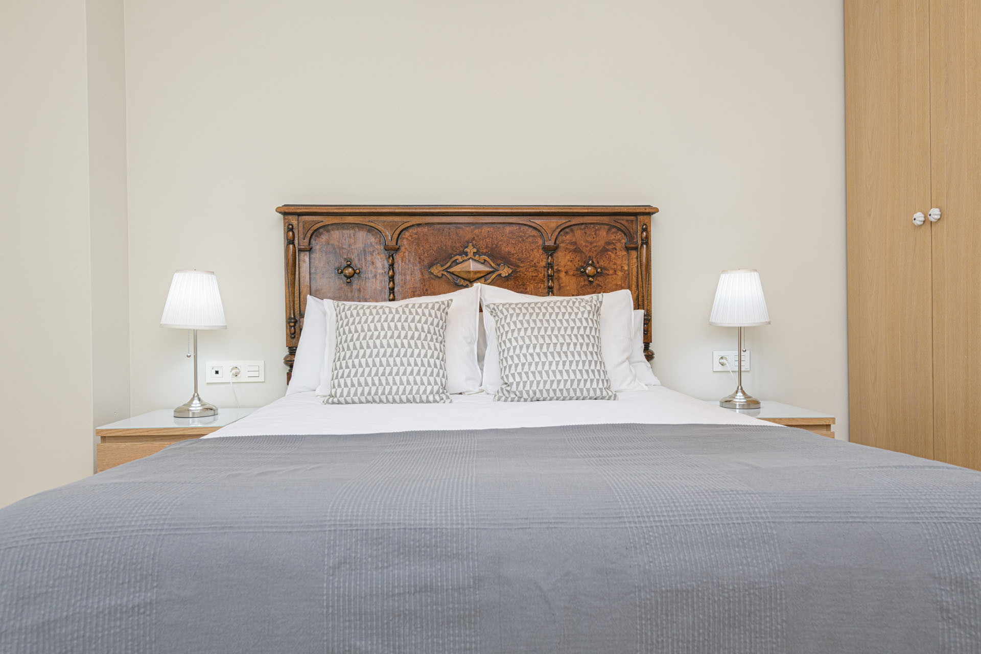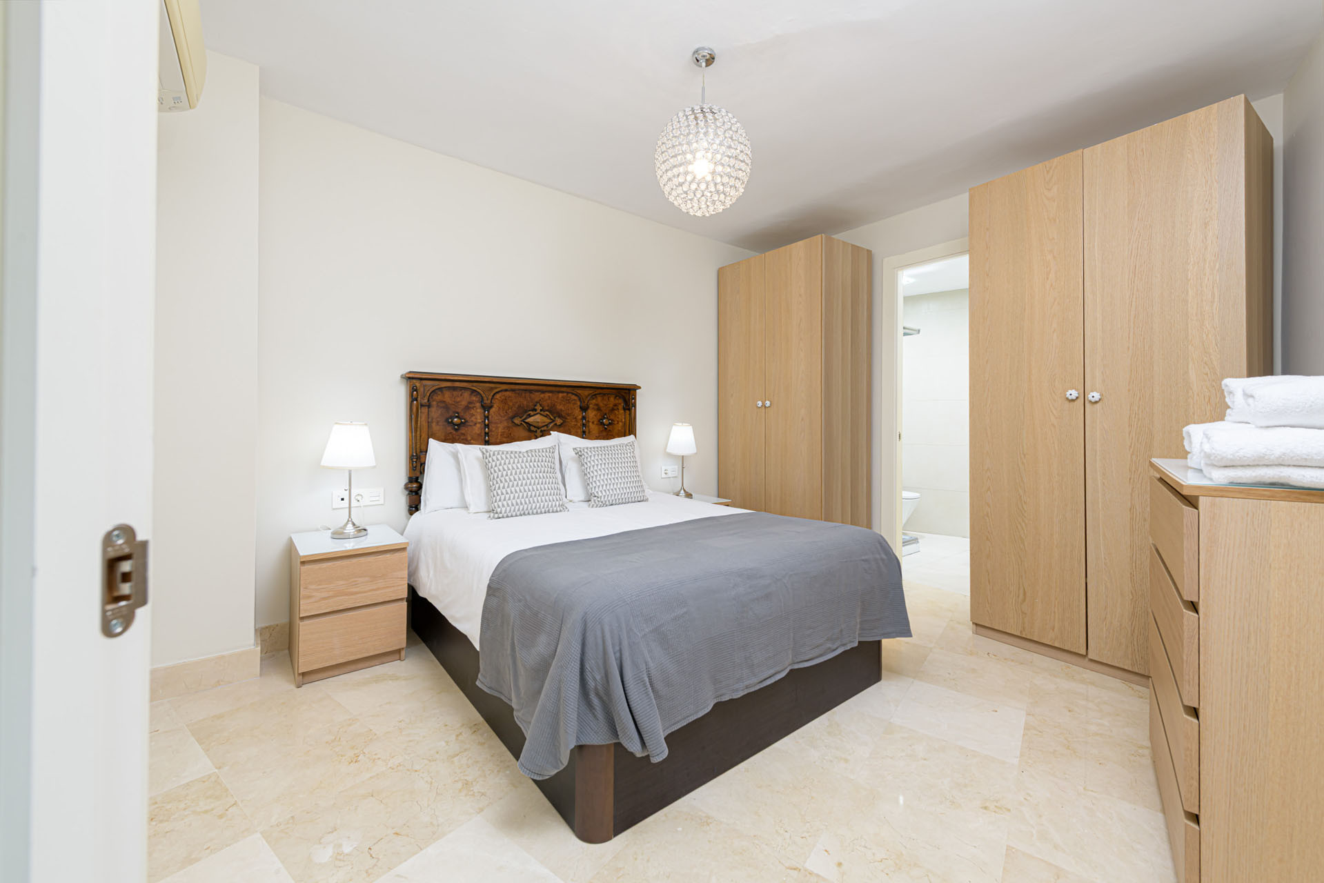 Soveværelset har en luksuriøs queensize-seng, der sikrer en hvilende nattesøvn efter at have udforsket den levende by. Lejligheden kommer fuldt airconditioneret med en varmepumpe, der giver komfort i enhver sæson. Høj hastigheds WiFi holder dig forbundet gennem hele dit ophold.