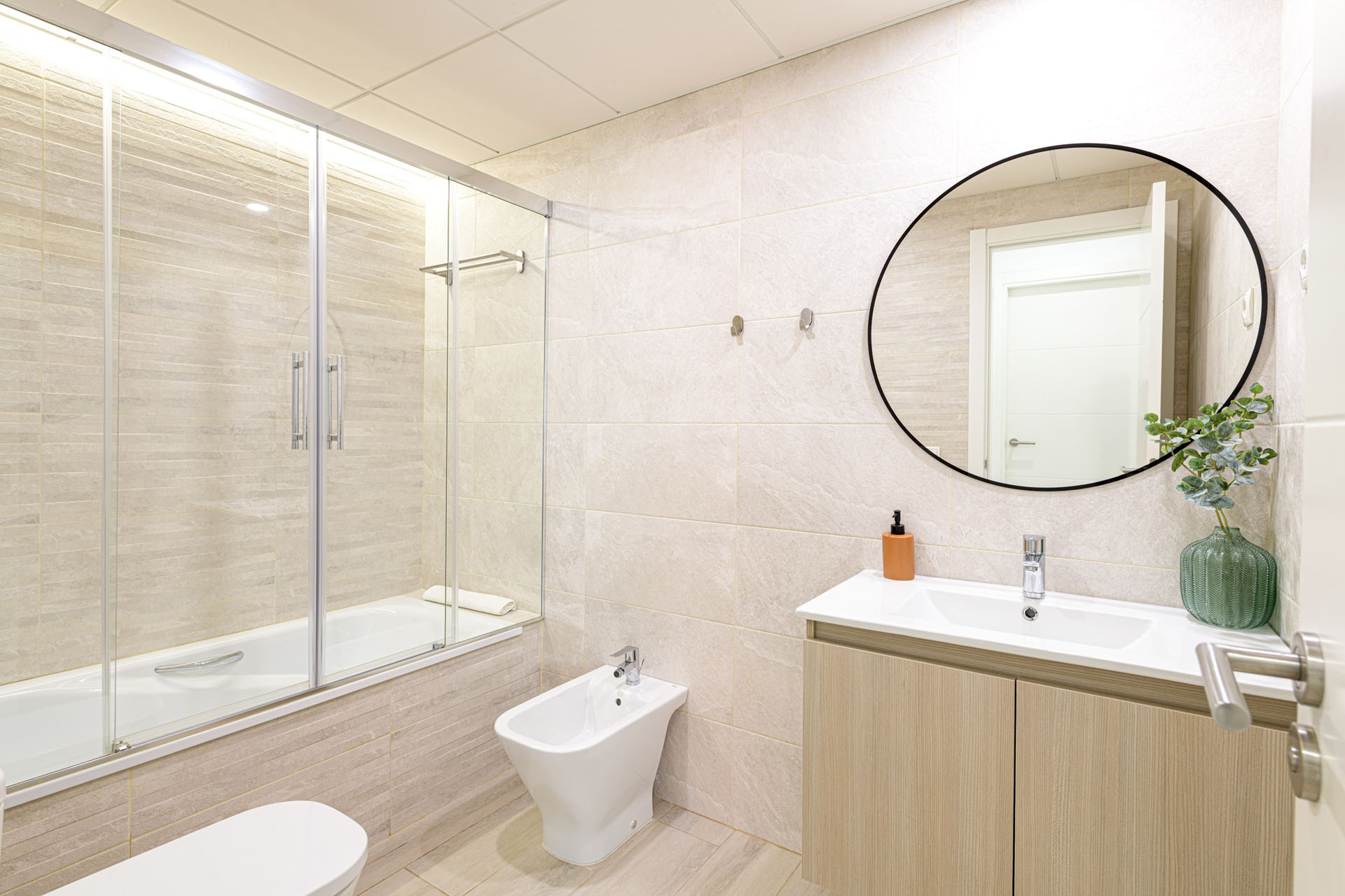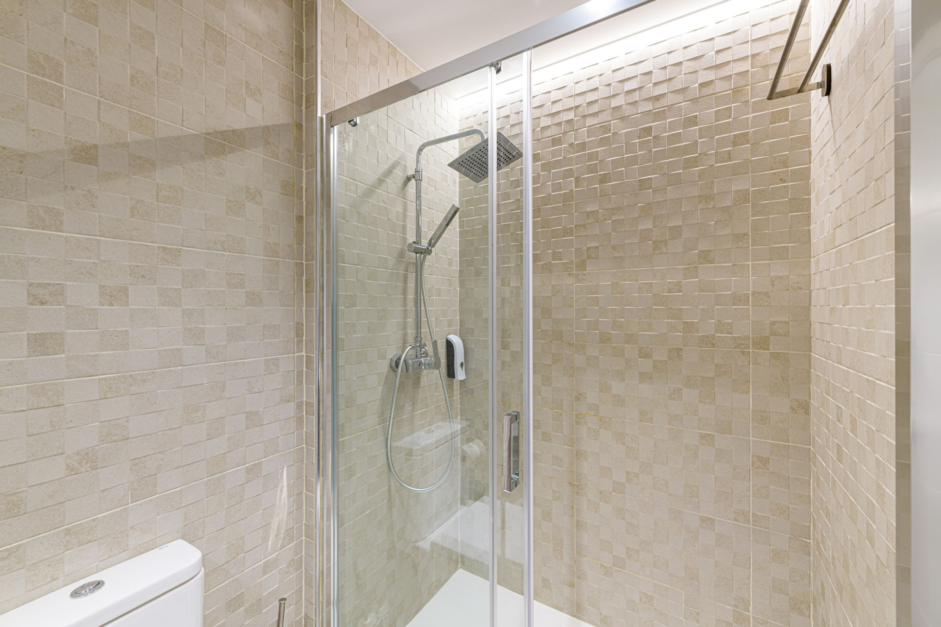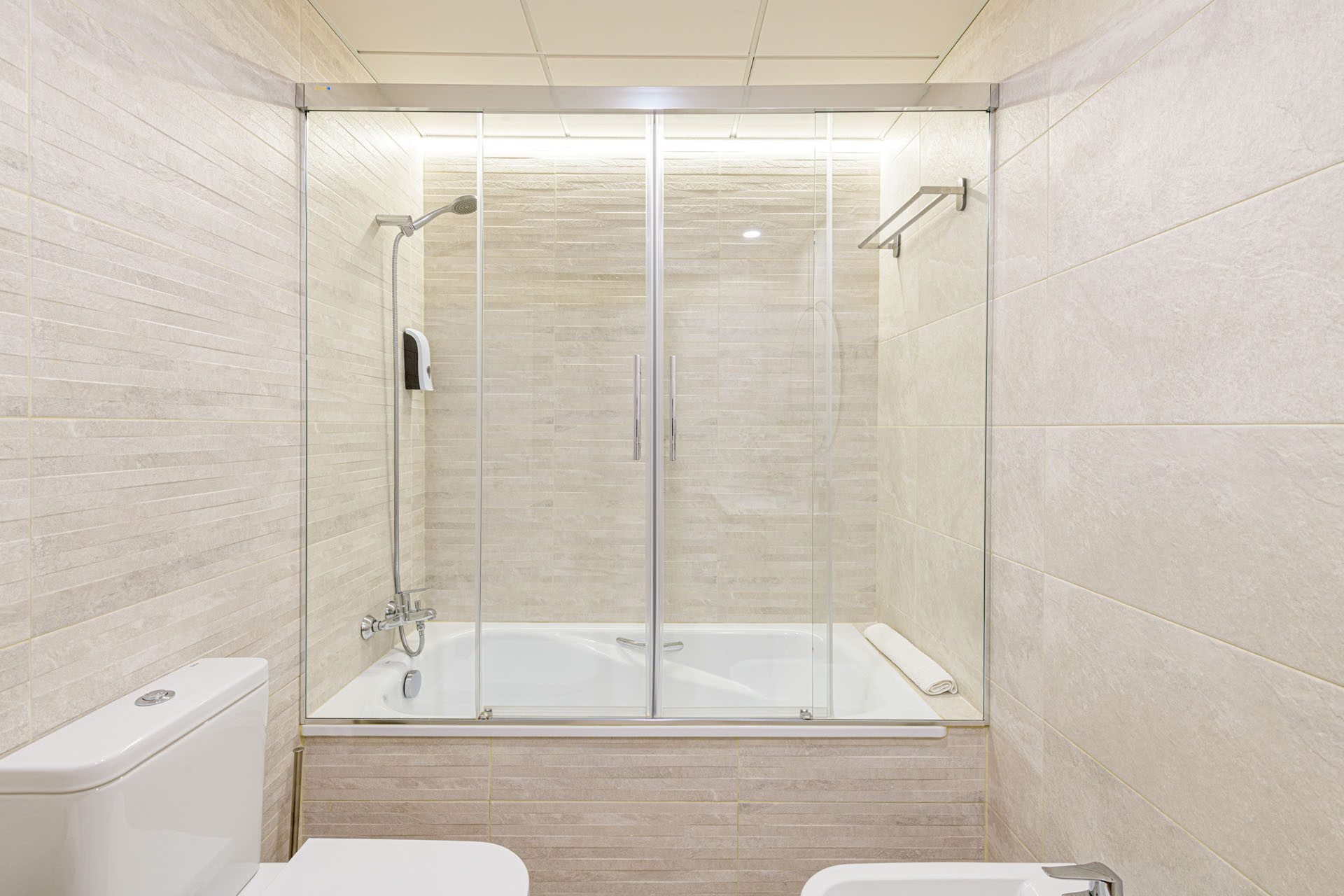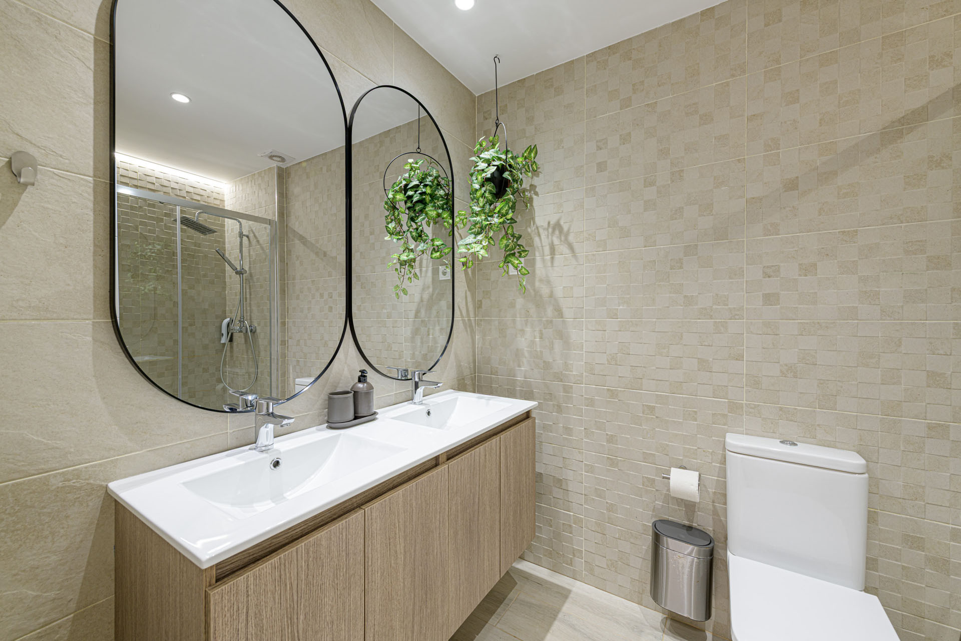 Komfort er nøglen i dette veldesignede rum, hvor aircondition og en varmepumpe sikrer en behagelig temperatur under hele dit ophold. Lejligheden omfatter to badeværelser - et med brusebad og et andet med badekar - hvilket giver bekvemmelighed for alle gæster. En praktisk strygejern er også tilgængelig til dine tøjbehov.