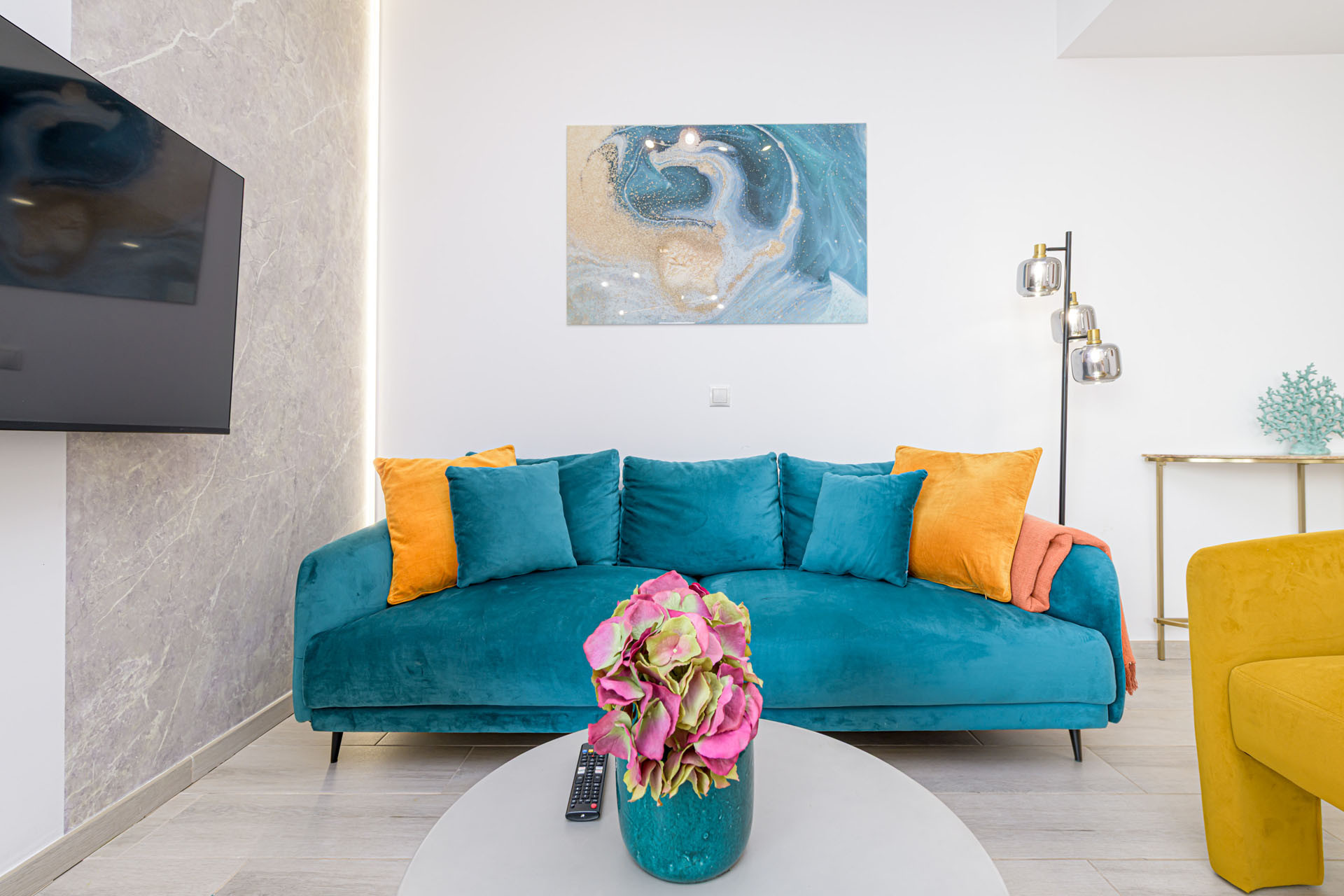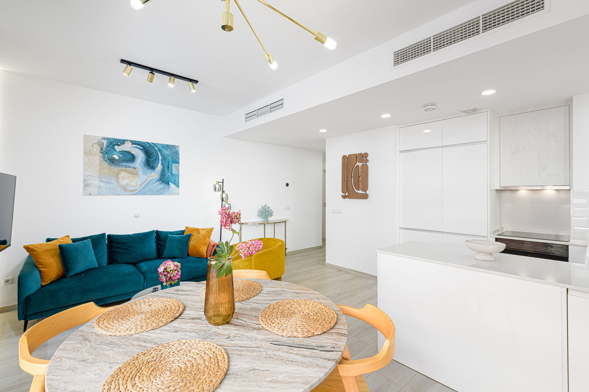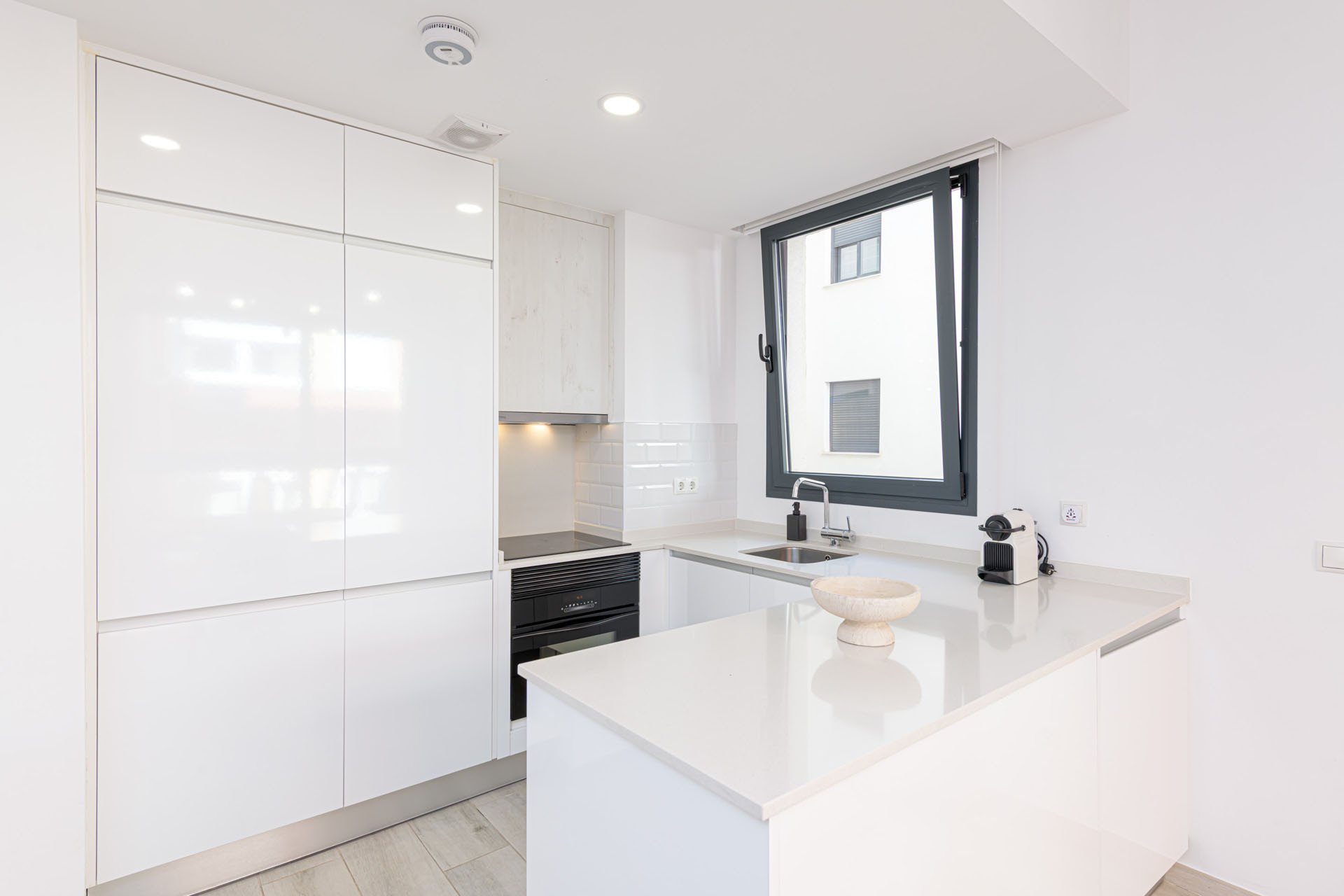 Lejligheden har et fuldt udstyret amerikanske køkken med alle de væsentlige ting, herunder et induktionskomfur, køleskab, fryseskab, opvaskemaskine, ovn, mikroovn, kaffemaskine og et komplet sæt køkkenudstyr. Hold dig forbundet med gratis WiFi og nyd underholdning på den medfølgende TV.